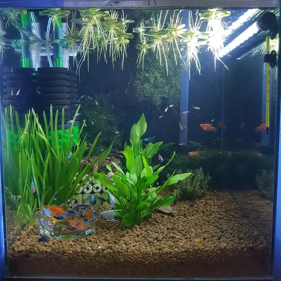 - Một chậu hoa để bàn độc đáo khi kết hợp trong các bể cá cảnh mini, tạo hệ sinh thái tự nhiên cho cá và tép.