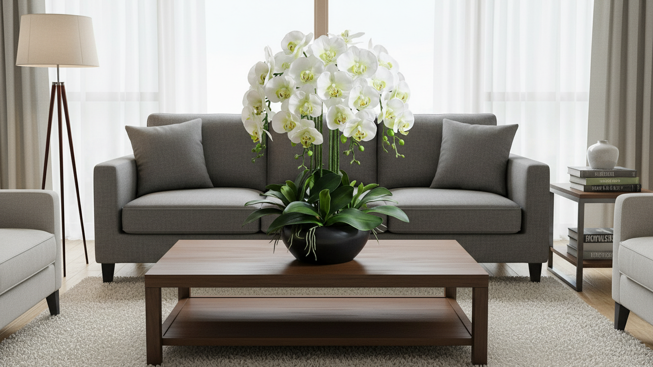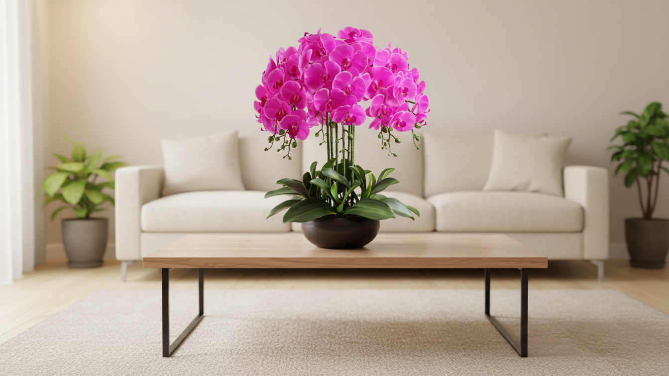 🌿 Điểm nhấn tinh tế cho bàn trà với chậu lan giả để phòng khách cao 60cm nhỏ gọn.
